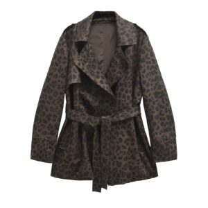 Women’s Leopard Print Lapel Closing Belt Long Sleeve Coat